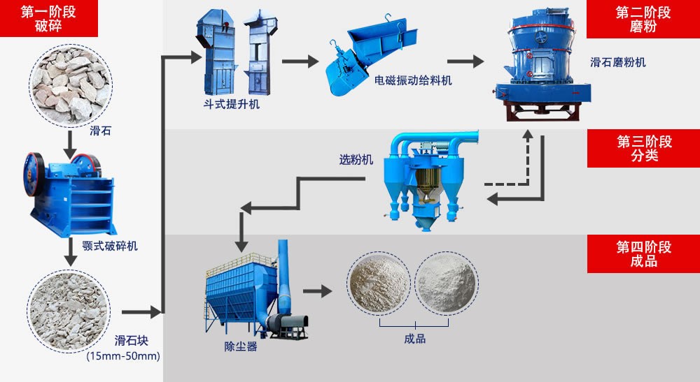 首先,大塊的滑石需要先用顎式破碎機進行破碎處理,破碎后的滑石由斗式提升機送入到儲料倉中;而后電磁振動給料機將料倉中的滑石均勻的給入到雷蒙磨粉機內進行磨粉作業;